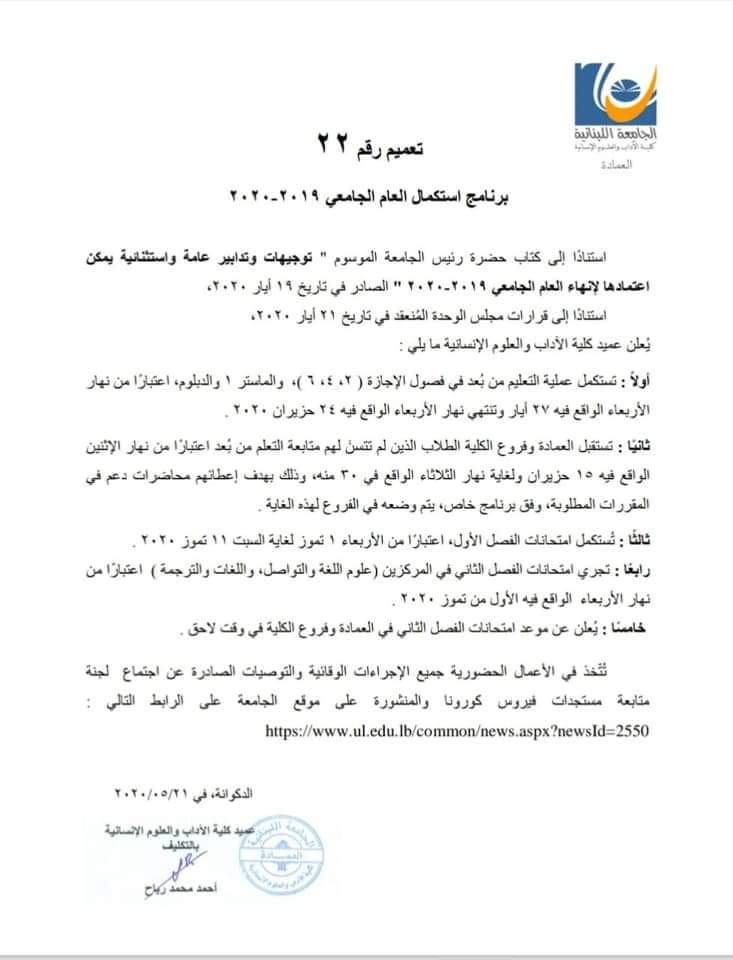 الجامعة اللبنانية حددت مواعيد الإمتحانات النهائية للعام الدراسي ٢٠١٩ / ٢٠٢٠